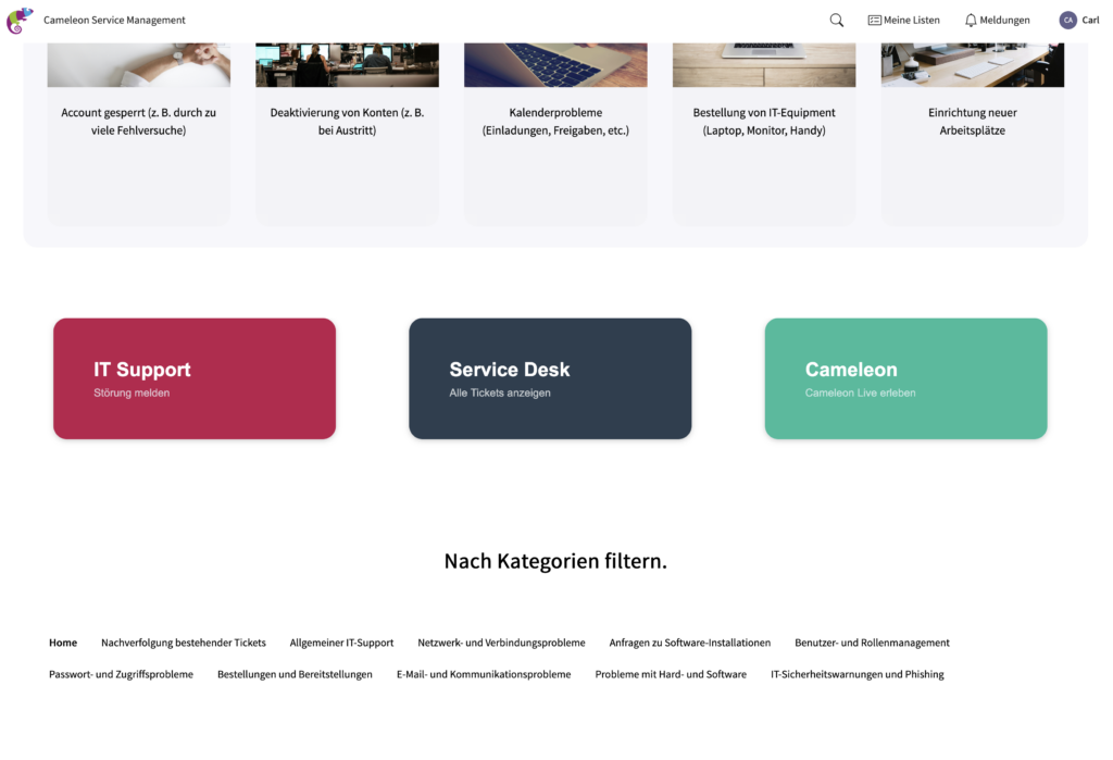 Unsere Plattform verfügt über ein leistungsfähiges, voll anpassbares Portal für den Zugriff durch Endanwender. Das Portal bietet die Möglichkeit, sämtliche in Cameleon angelegten Prozesse anzustoßen, den aktuellen Stand eines Vorgangs einzusehen und mit den jeweiligen Teams zu interagieren. Die Oberfläche ist bewusst einfach und intuitiv gehalten, um alle Services dem gesamten Unternehmen zur Verfügung zu stellen – Eine Anfrage oder Bestellung aufzugeben ist so einfach, wie Onlineshopping!